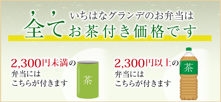 税抜2300円以上のお弁当には、PET茶(500ml)をご用意。